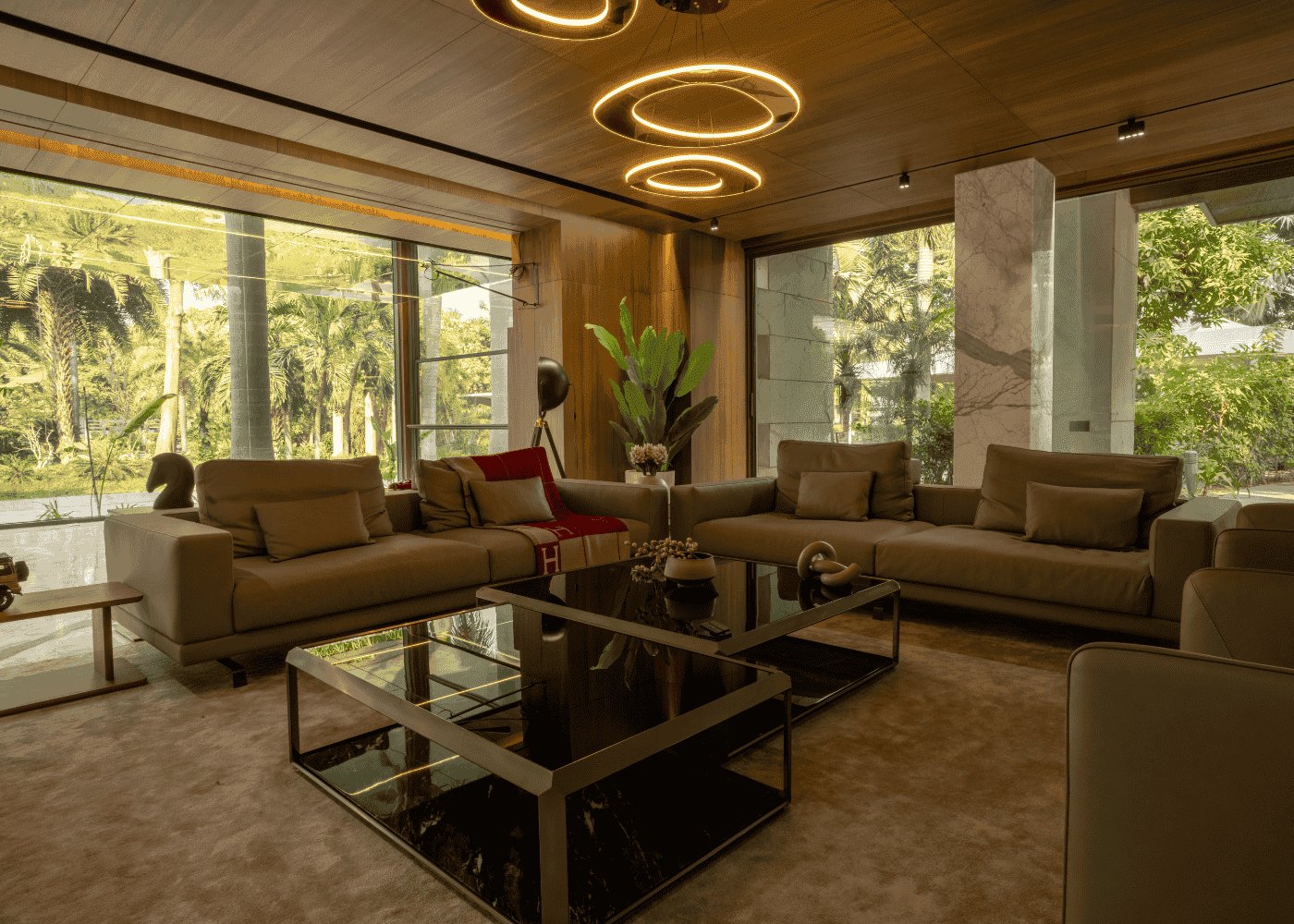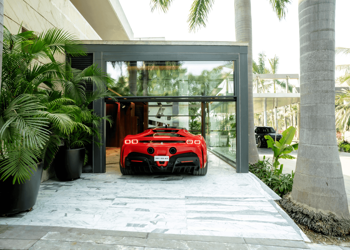 A standout project featuring a Ferrari showcased inside the lounge — enclosed with sleek, high-clarity glass. The glazing brings in natural light while turning the car into a visual centerpiece, blending luxury living with refined design.